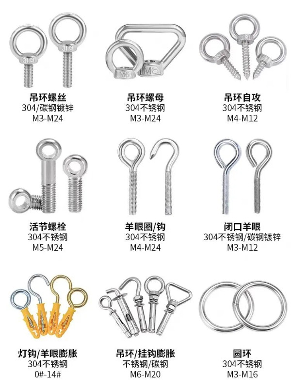 Eye bolts, also known as eye bolts, are bolts with a ring-shaped structure, primarily used to attach heavy objects or as suspension points. They are widely used in various industrial and domestic applications, such as furniture assembly, securing outdoor equipment, and assembling bridges, tower cranes, and hoisting equipment.